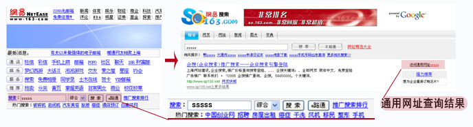 用户在网易的网站搜索中输入搜索词,点击搜索按钮后出现网易的搜索结果,在搜索结果的首行,有通用网址的文字链接,点击此文字链即可实现访问通用网址的功能。