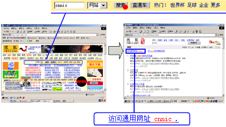 在搜狐的网站搜索中输入通用网址,点击"搜索"按钮,在结果页面出现通用网址文字链标志,点击后可以进入相关网站。
